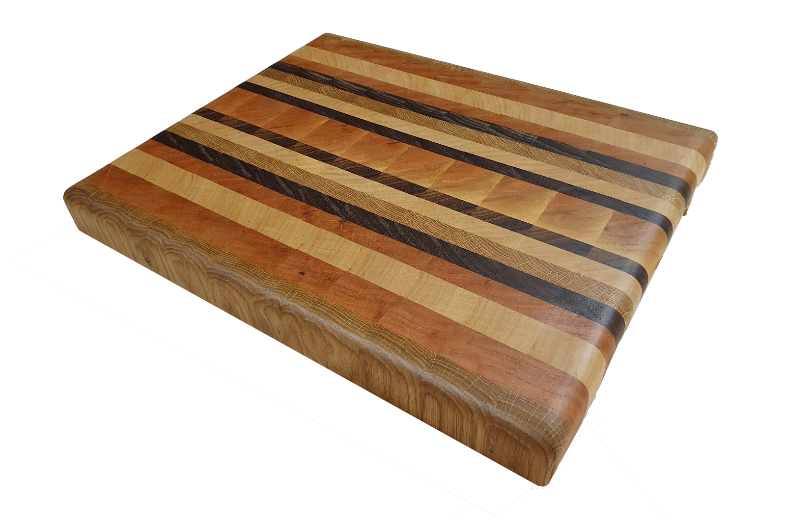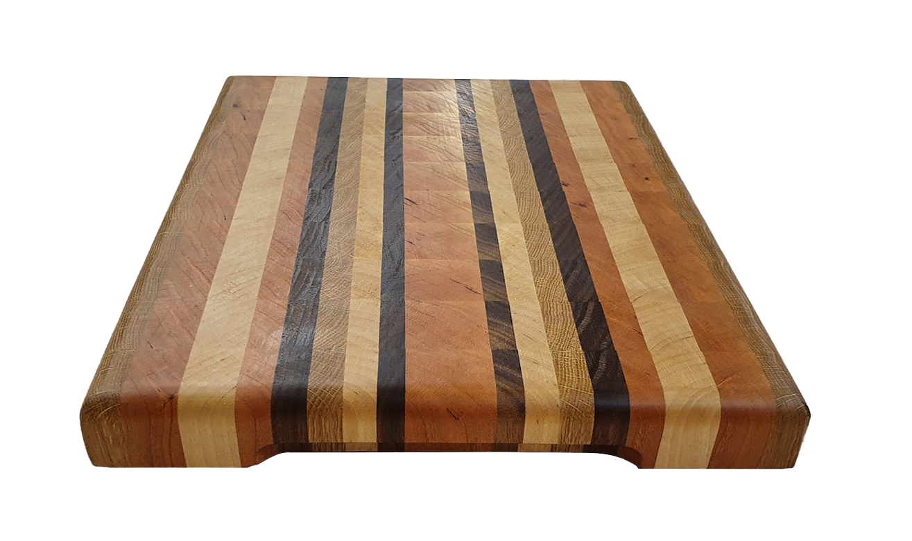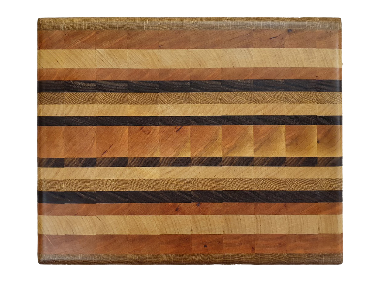 Mosaiik lõikelaud mis on valmistatud Eesti tammest, Ameerika pähklist ja kirsipuust.