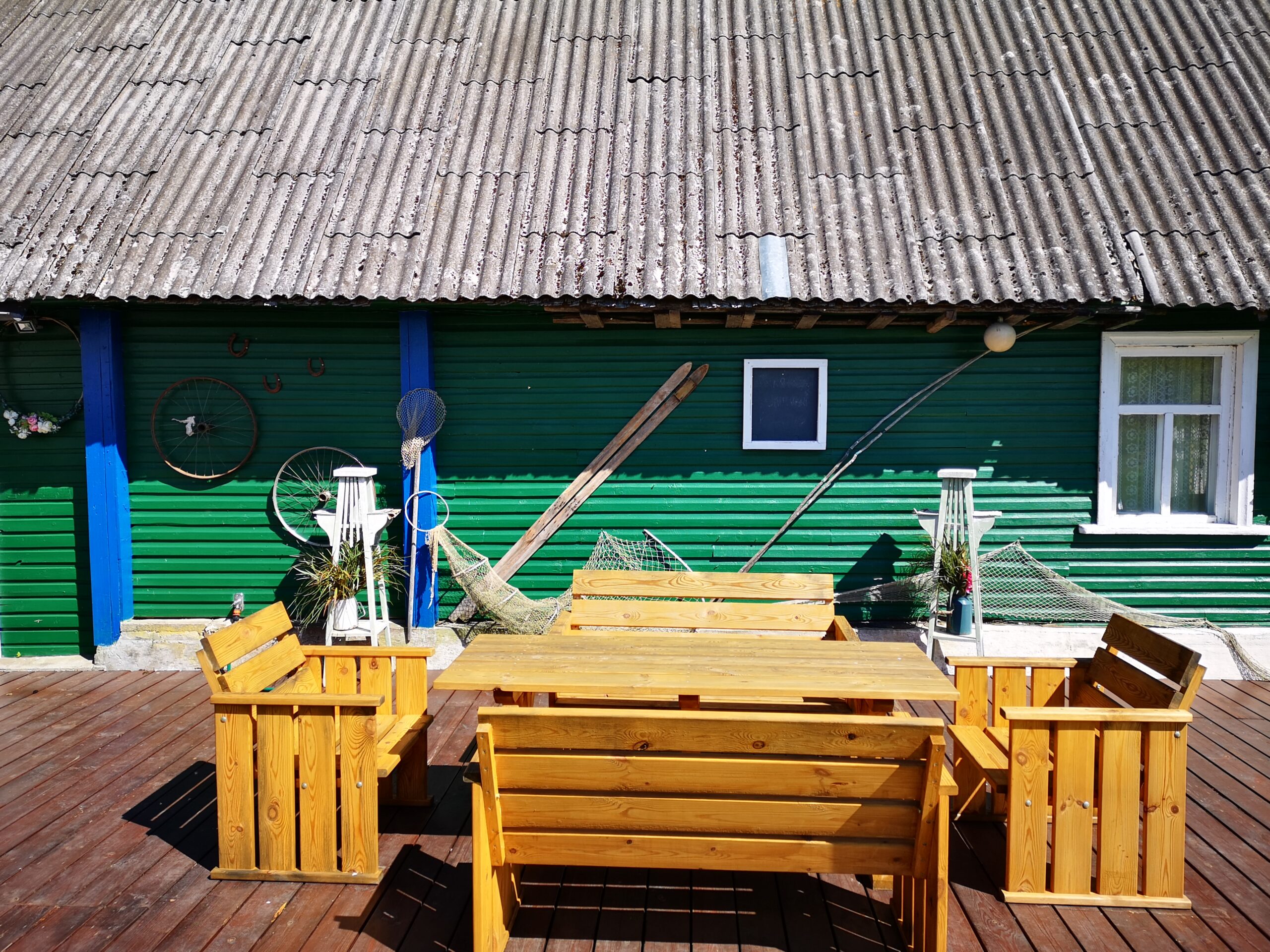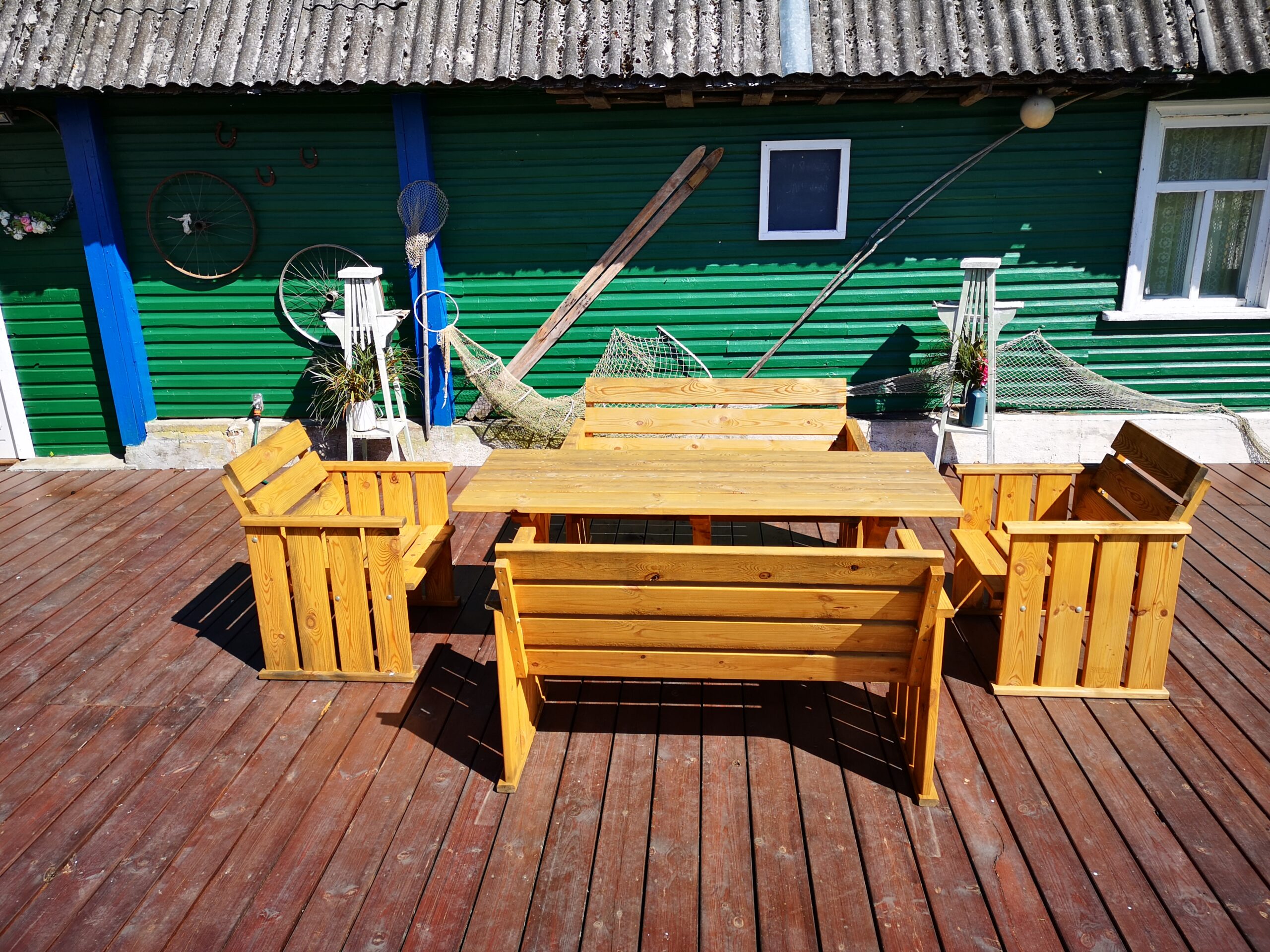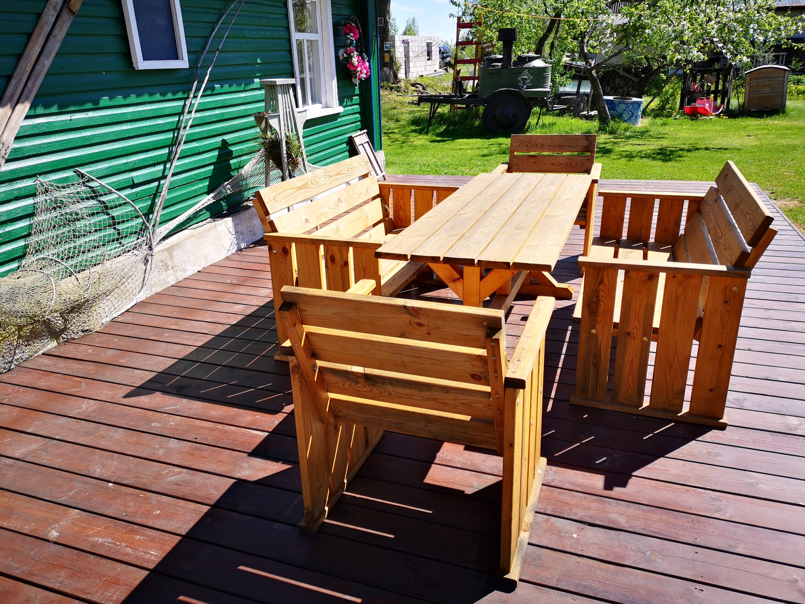 Komplektis on laud, kaks kahekohalist pinki ja kaks ühekohalist tooli.